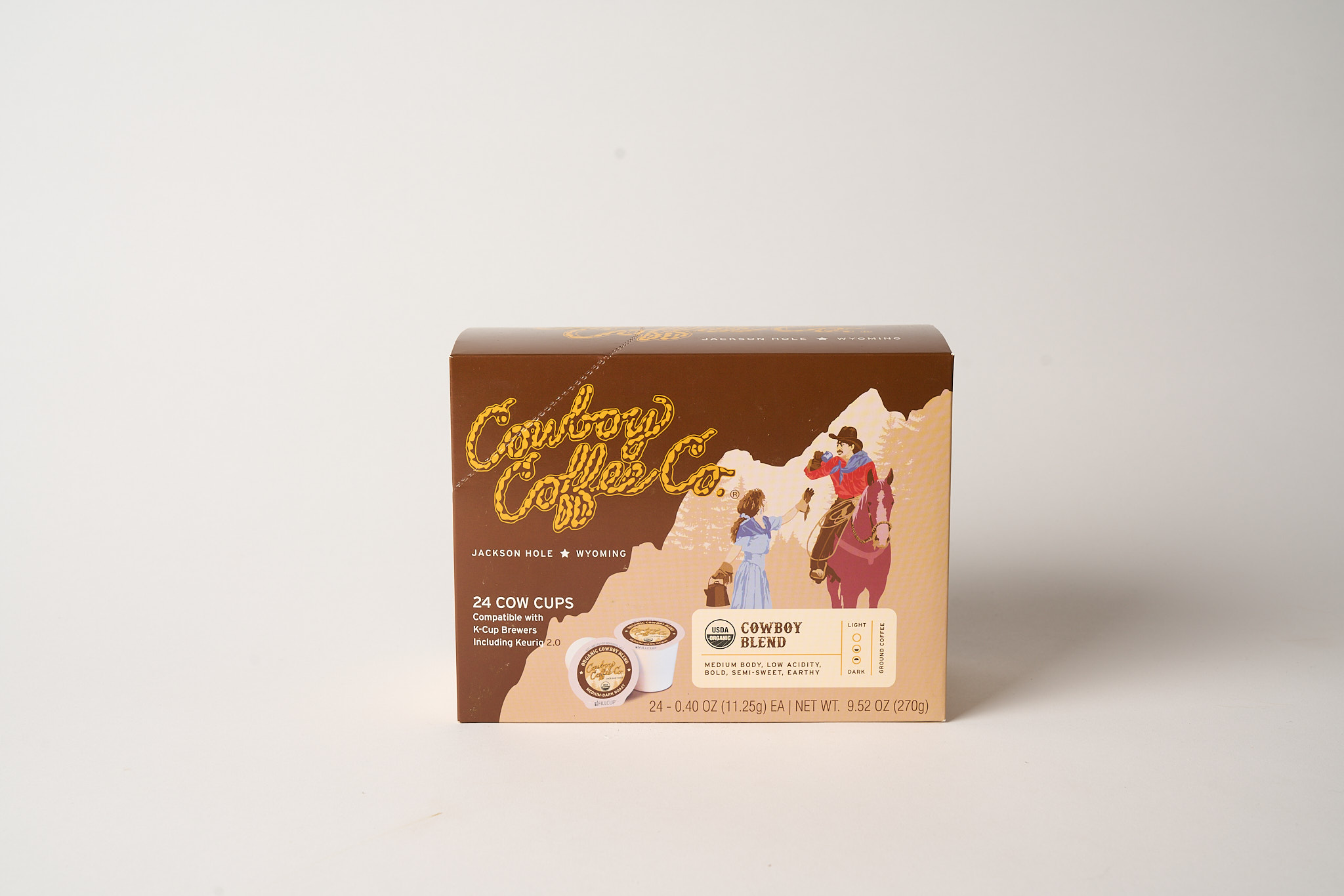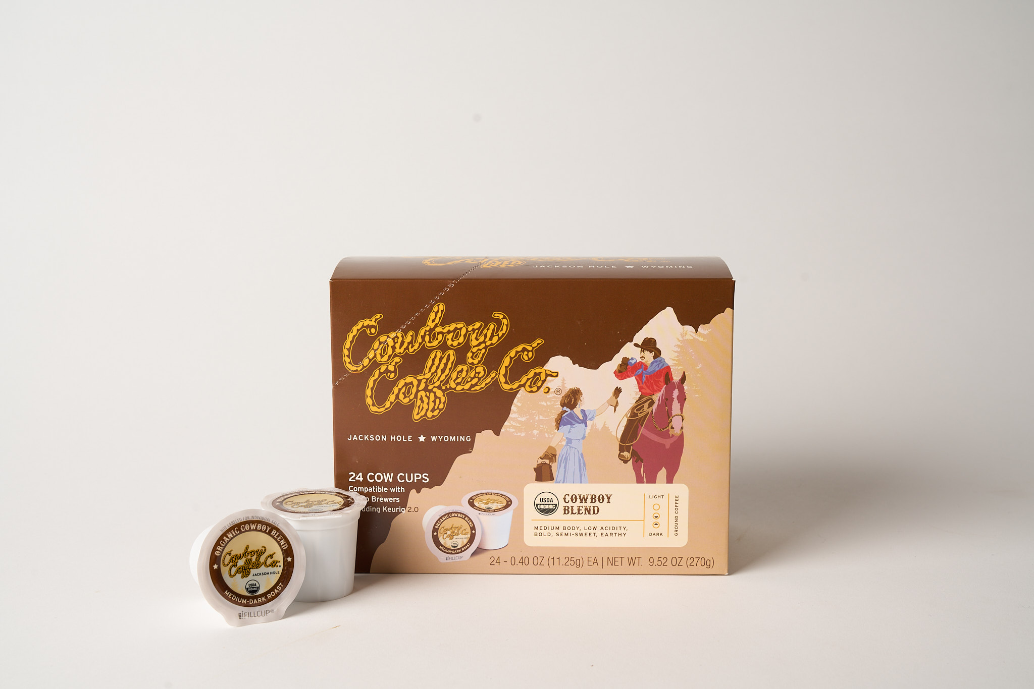 These Organic Cowboy Blend Cow Cups offer a semi-sweet, earthy, flavor with medium-body and low acidity all roasted, ground, and packaged in-house in Jackson, WY. Each cup contains more coffee and finer grinds, thanks to innovative iFillCup pods, resulting in a balanced and full-bodied taste that sets them apart from standard single-serve options. Compatible with all K-Cup® systems, these pods make it easy to enjoy a rich, satisfying brew wherever you are.